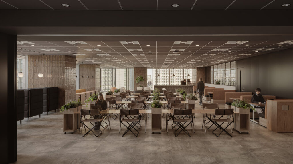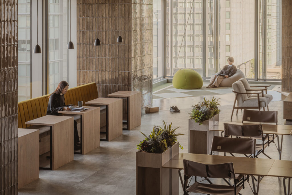 目的に応じて座席を選べるカフェスペースは、従業員のリフレッシュやコミュニケーションを自然に促す場となっています。