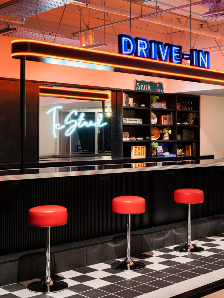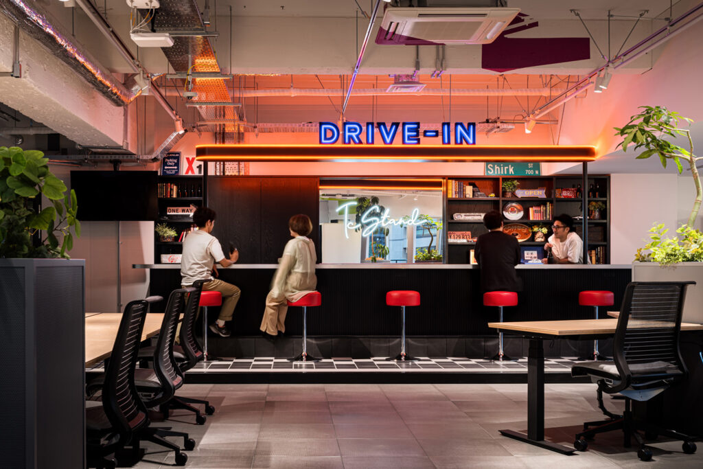このスペースは世界初のドライブイン「Pig stand」から着想を得ており、従業員が自由に集まって自然にコミュニケーションを取れる環境が整っています。