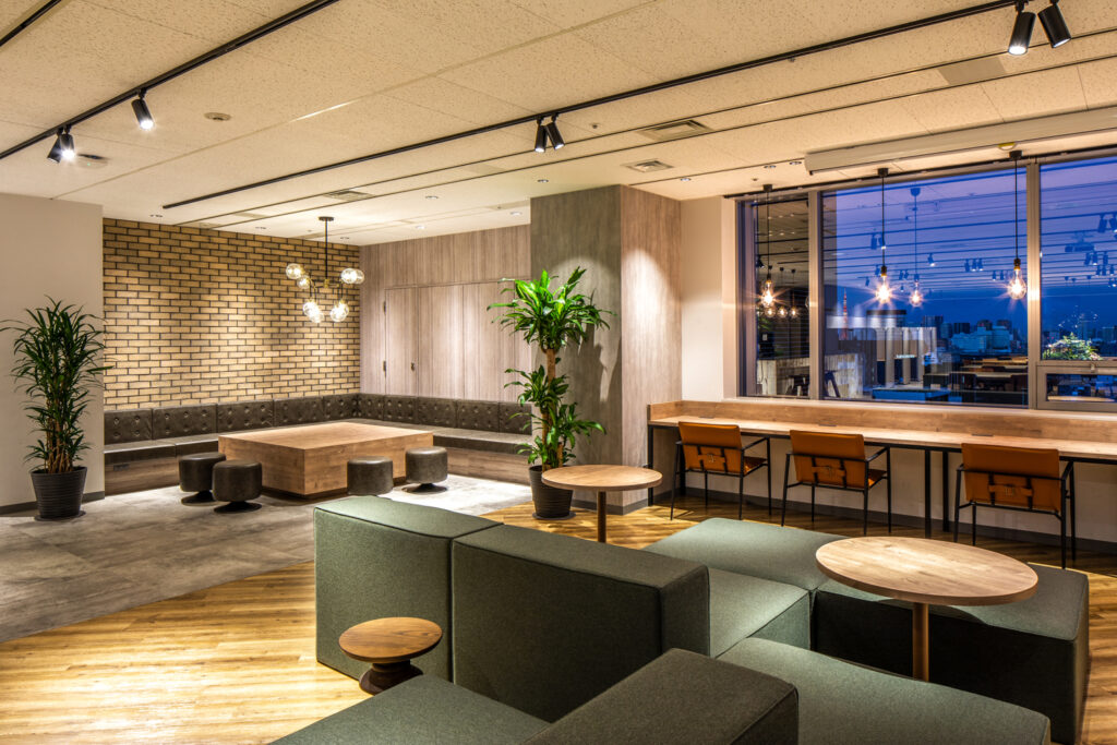 執務スペースは集中しやすい落ち着いた雰囲気に仕上げています。一方のリフレッシュスペースはインダストリアルな素材感で、社員の方々が多様な過ごし方ができるようになっています。
