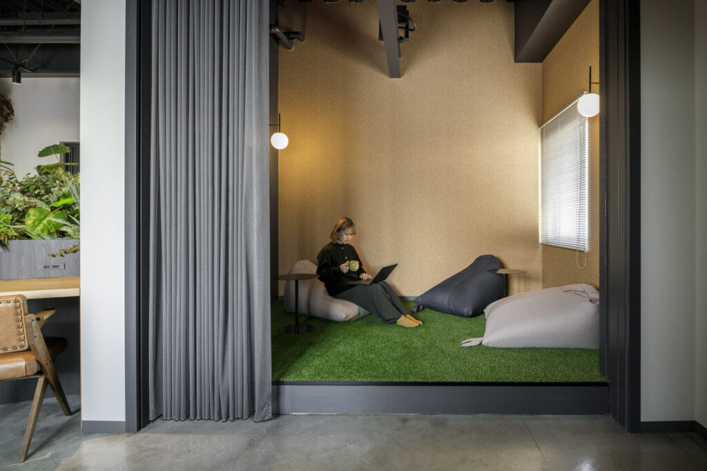 人工芝を敷いたリフレッシュスペースの壁には、ウッド調の壁紙を採用。靴を脱いでゆったりとした空間で過ごせるように壁紙でナチュラルな雰囲気を演出しました。