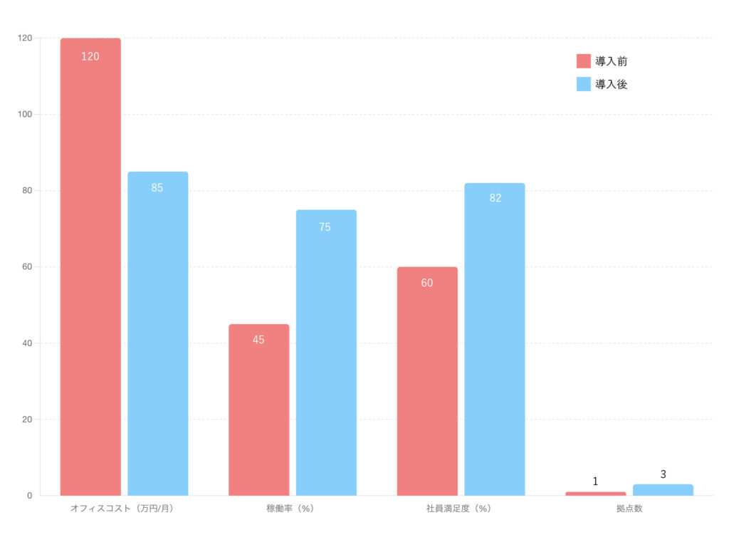 以下のグラフは、導入前後の定量的な効果を示した一例です。オフィスコストの最適化、稼働率の向上、満足度の改善、そして拠点数の増加といった複数の観点から、導入効果を客観的に把握できます。