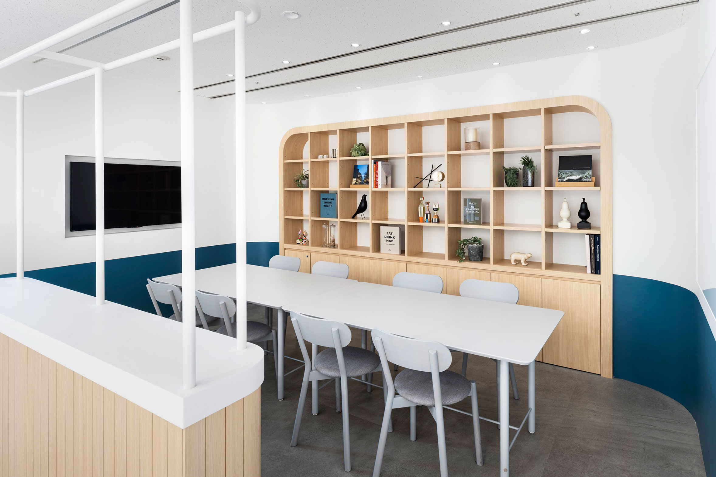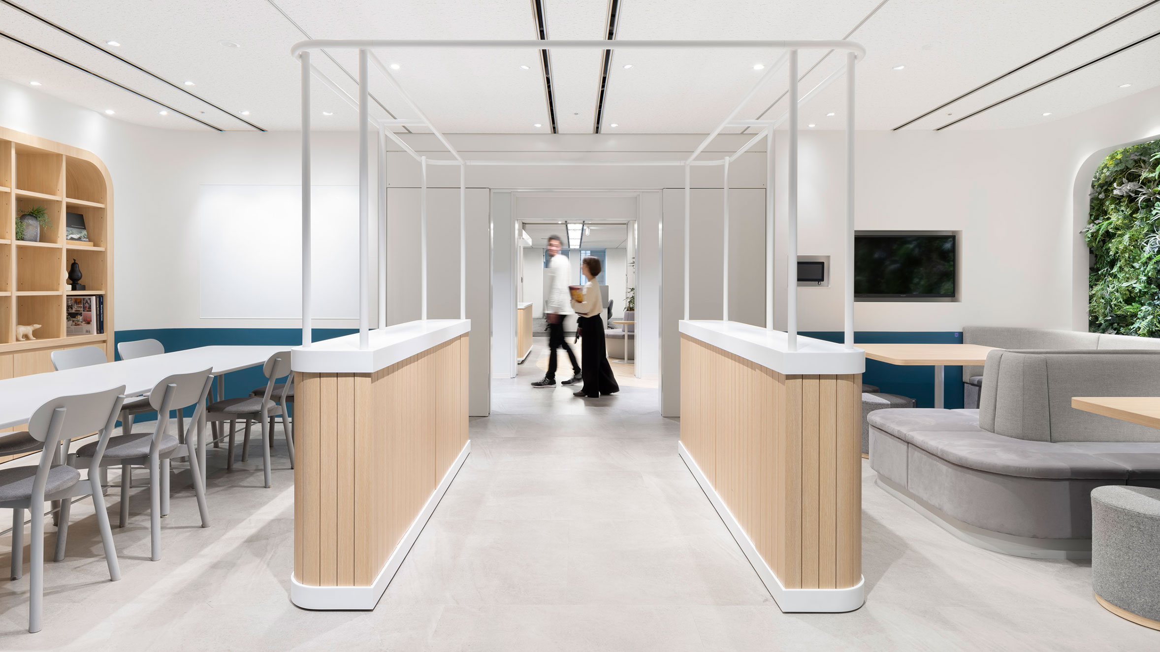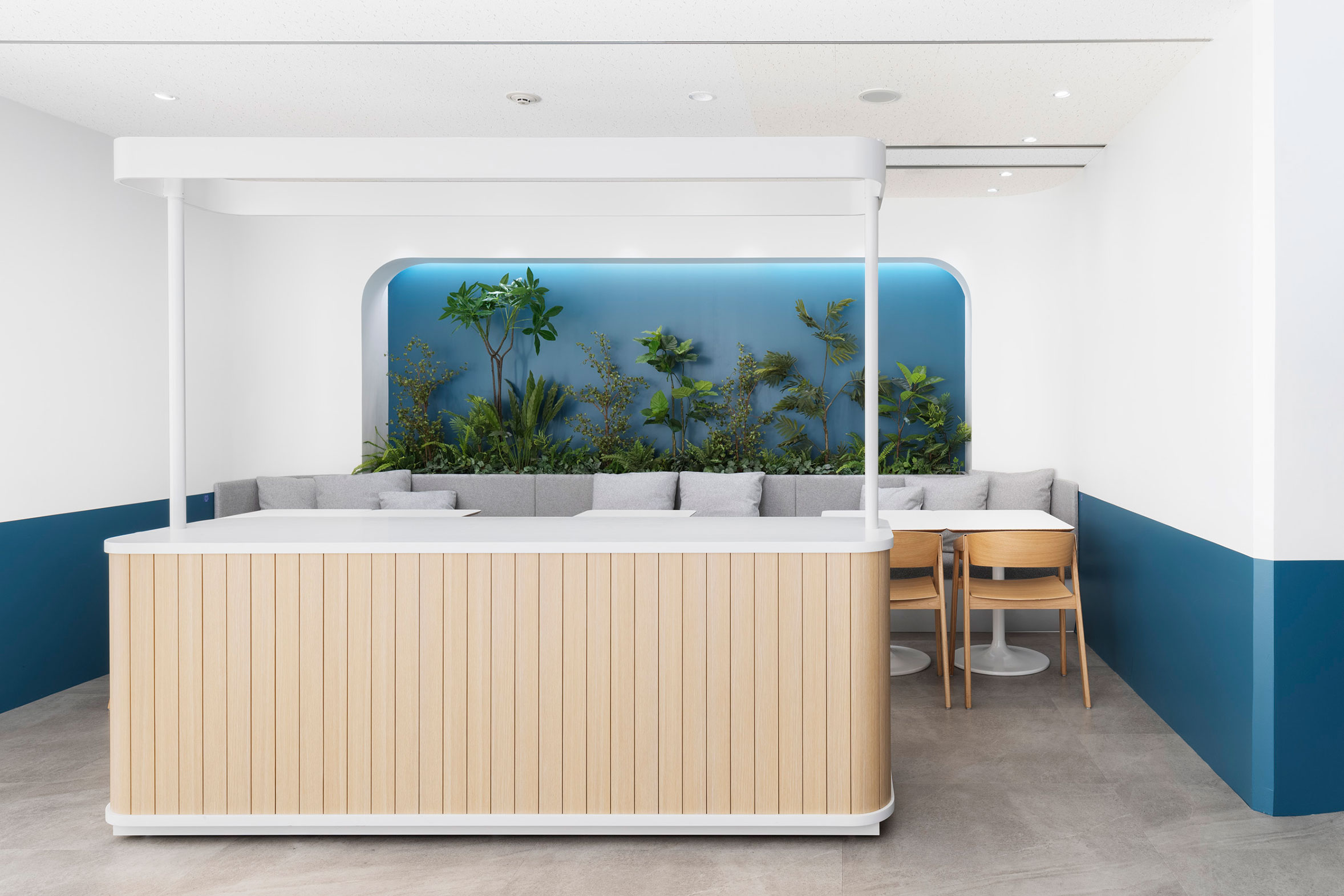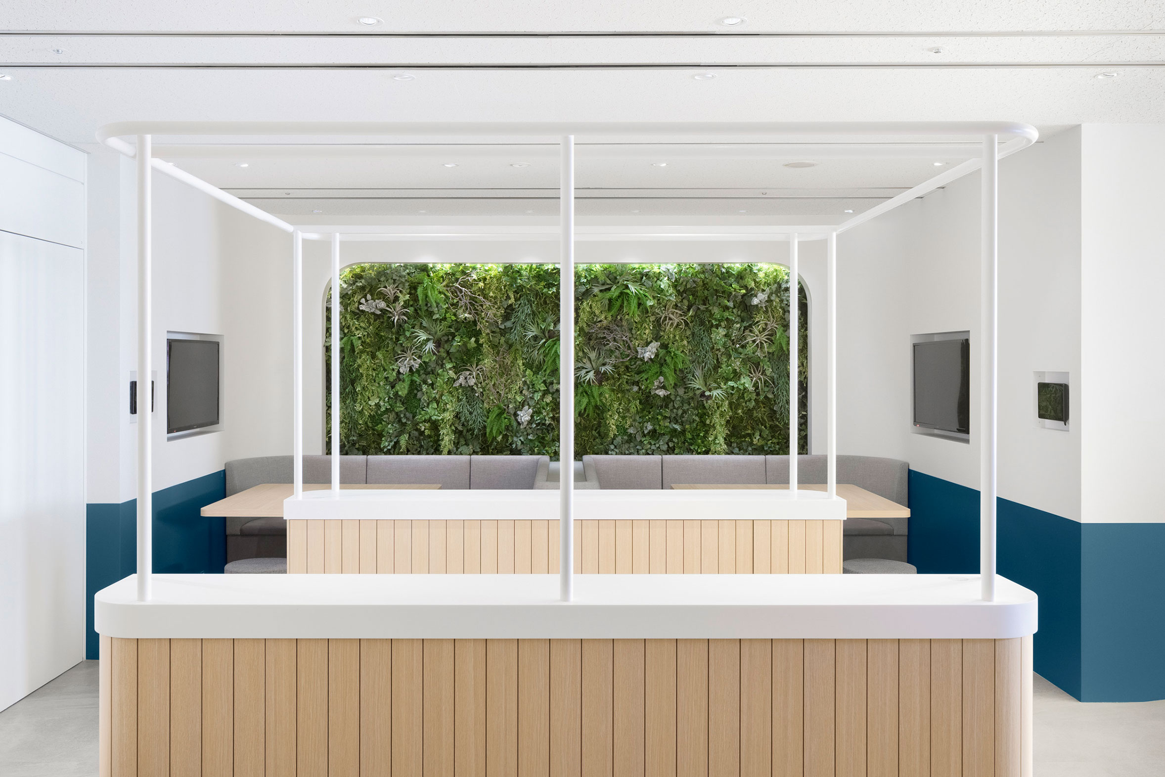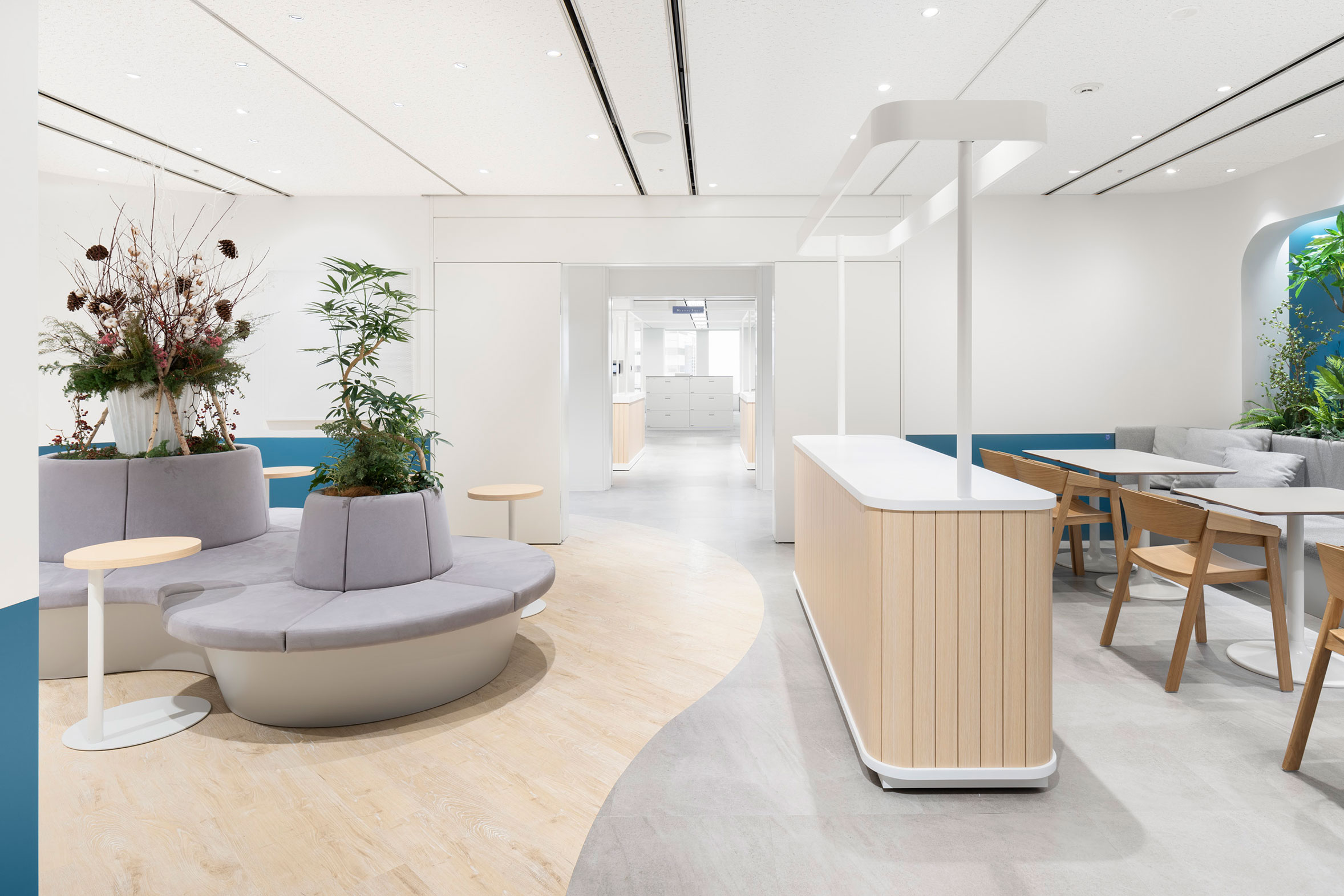総合不動産事業を手掛ける野村不動産株式会社様。オフィスの2つの執務スペースを繋ぐ共有通路を、コミュニケーション&ウェルネスをテーマにデザインしました。気軽に社員が集まって交流できる空間となっています。