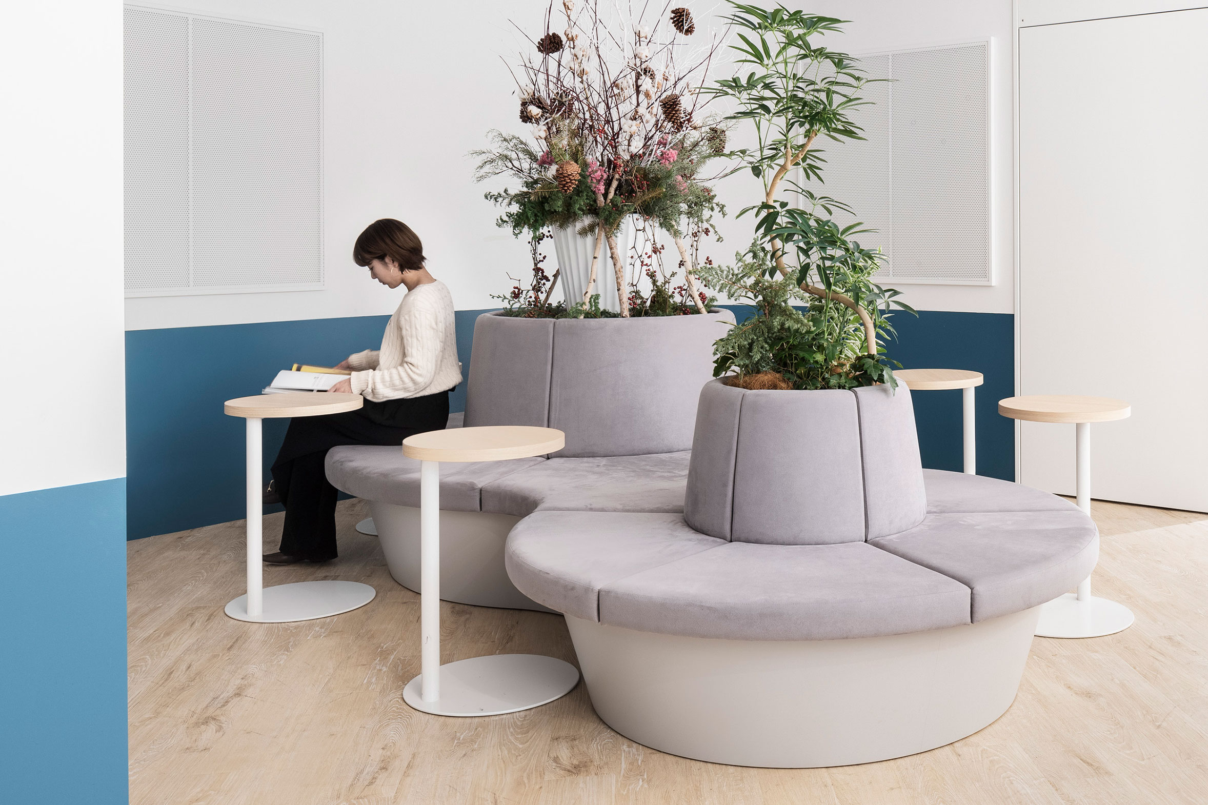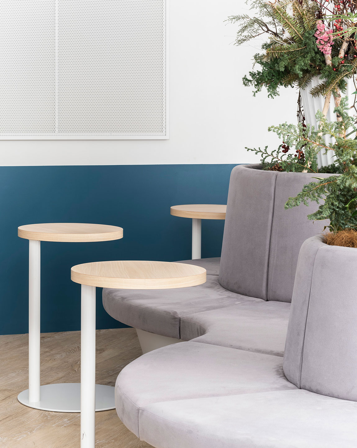 また、社員の方々からもリクエストいただき、アメーバ型のソファをメインに空間全体にアールを取り入れ、柔らかな印象になるようなオフィスデザインを目指しました。