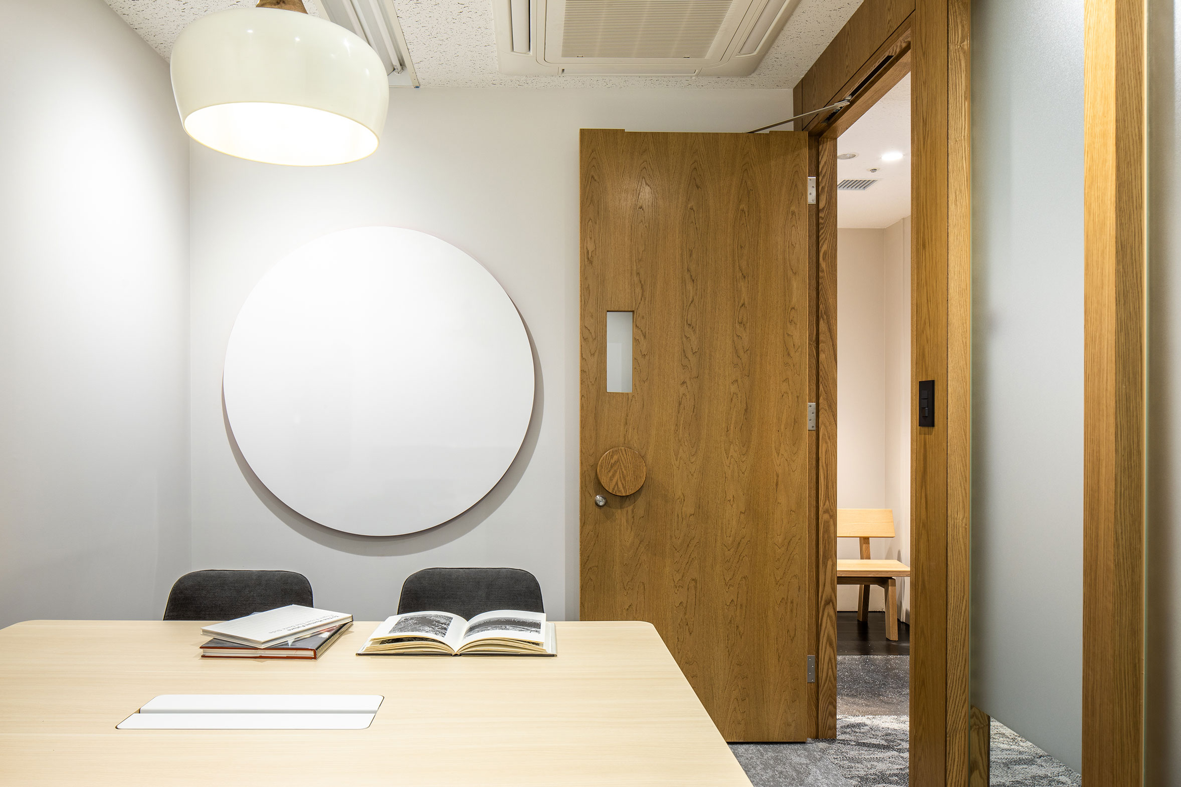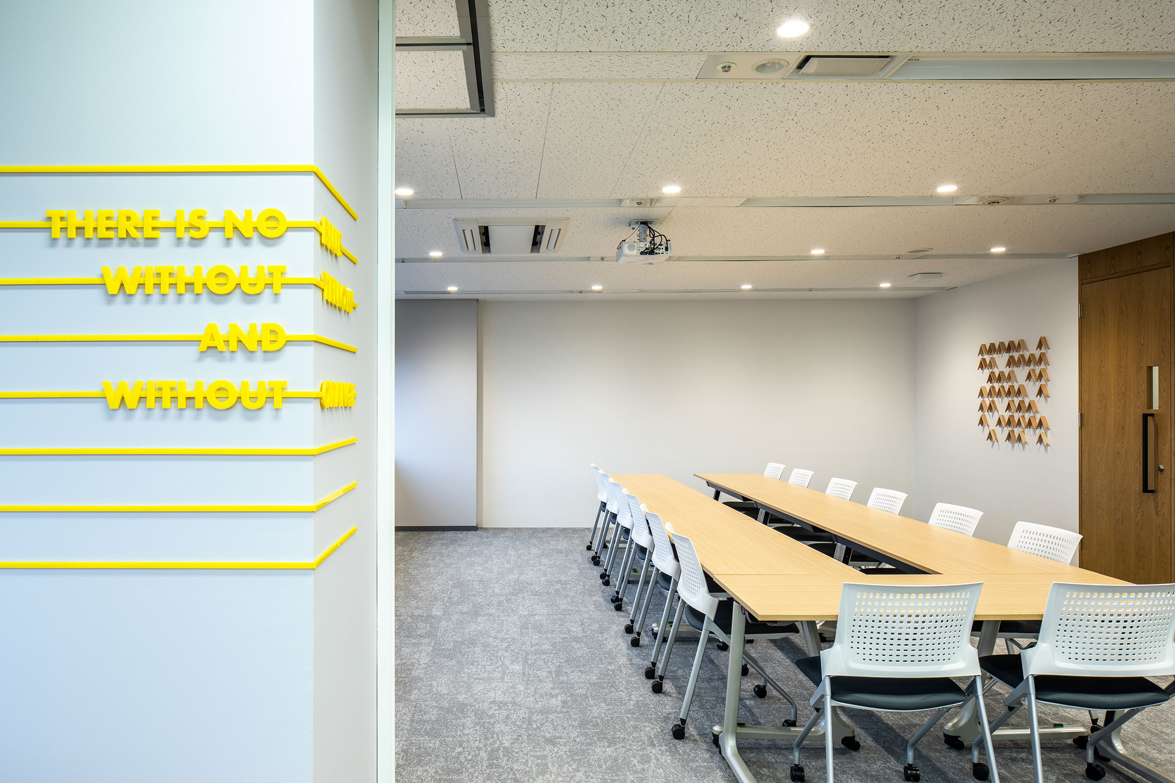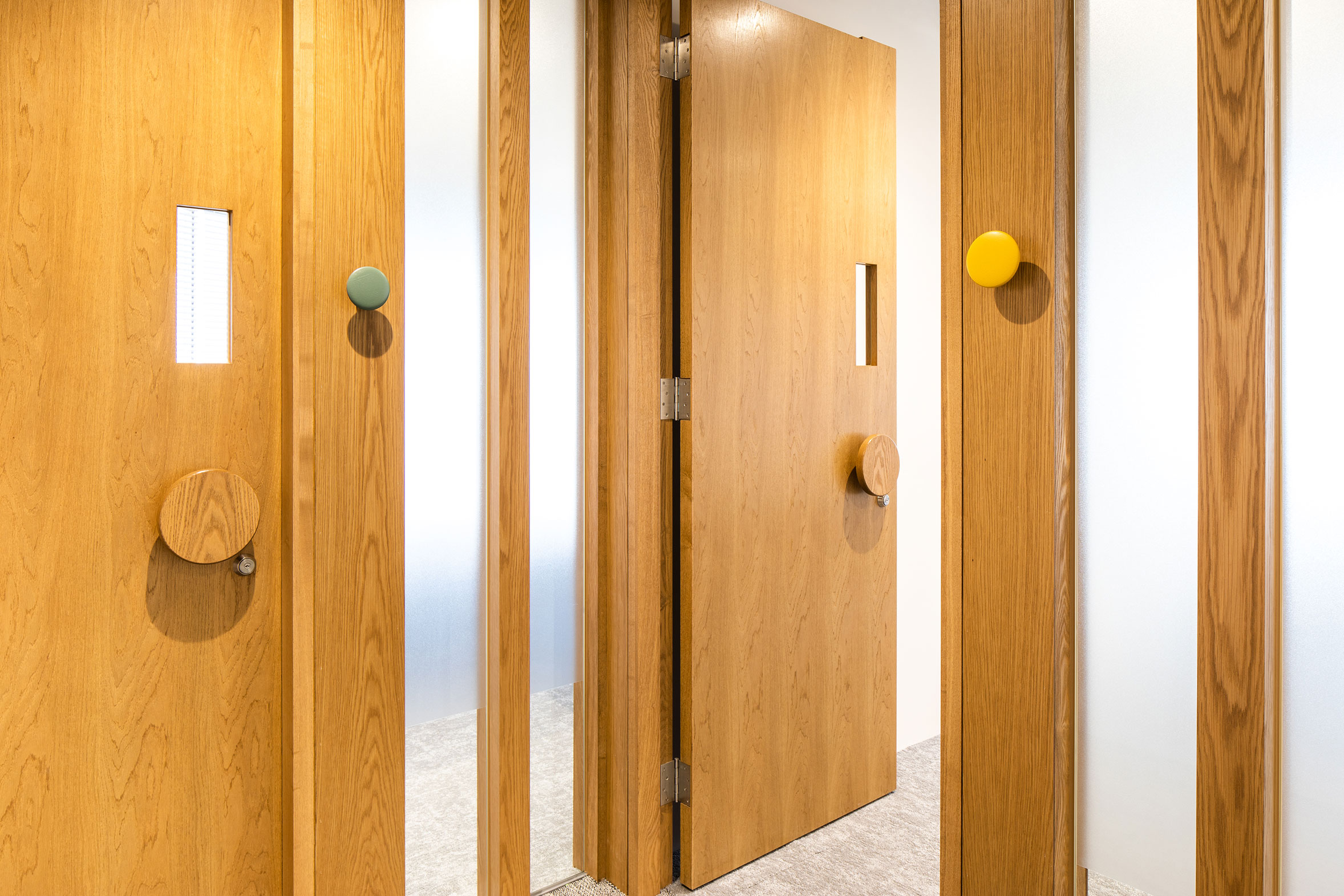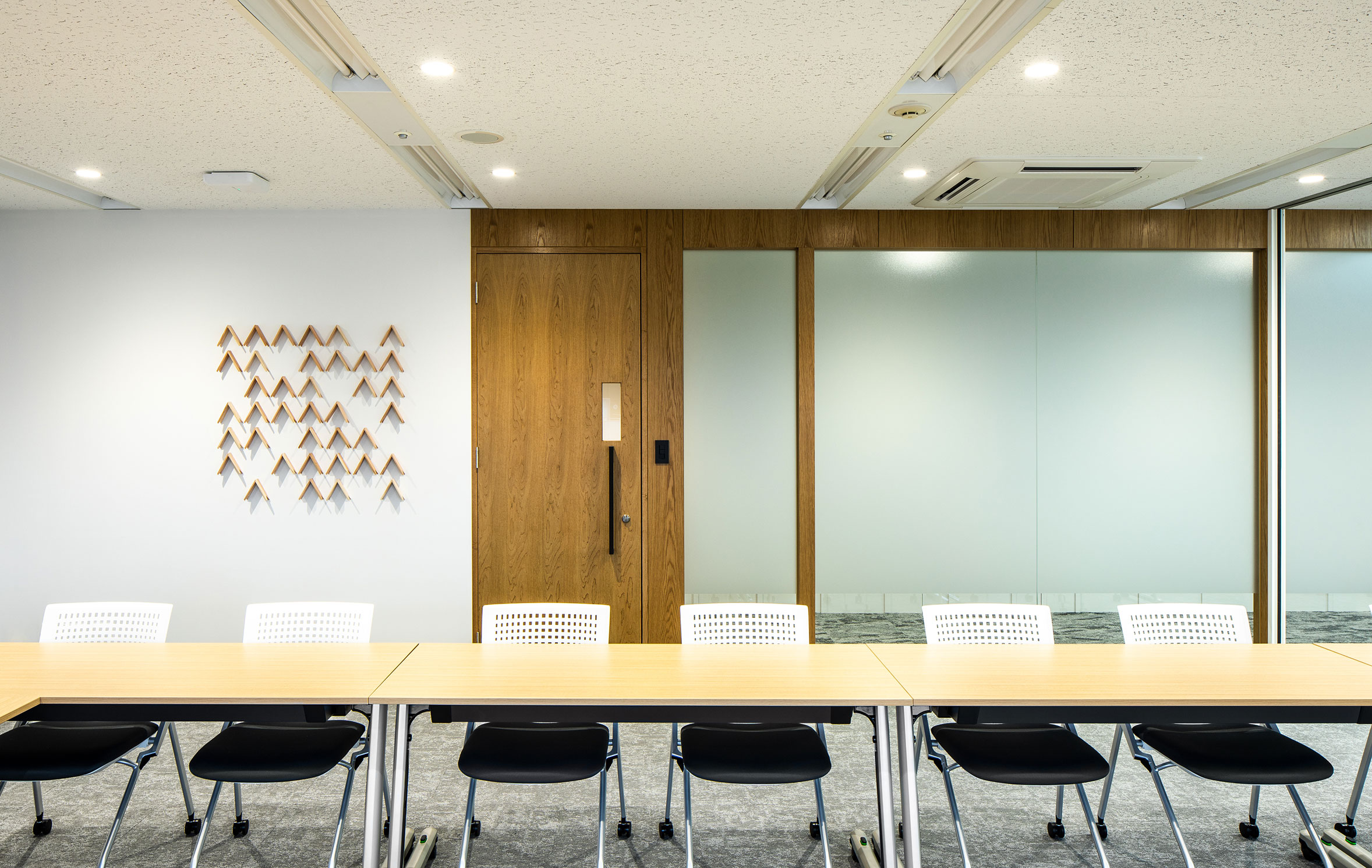 フリースペースは、チェアの色を変えたり、異なる色でヘリンボーン張りの床にするなど、空間に動きをつけました。エントランスから伸びる社外用の各ミーティングルームのドアに取り付けた、丸形のドアハンドルが印象的。その横にデザインされたルームサインはアクセントとしての役割をもたせながら、さりげない色分けで視認性を高めています。